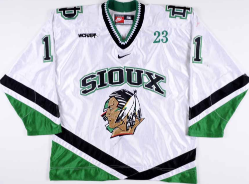 I decided to go for a college jersey for this week’s hockey entry and ended up picking Zach Parise’s sweater from his University of North Dakota days. In Parise’s first game at UND, he scored a hat trick, becoming only the second freshman to do so since 1988. After his freshman season (2002-2003), he was named a Hobey Baker Award finalist, which goes to the best NCAA hockey player each year. Parise entered the 2003 NHL Draft, where he was selected by the New Jersey Devils with the 17th overall pick. Once he was drafted, he did return to UND for his sophomore season, where he helped the Sioux win the MacNaughton Cup as the WCHA regular season champions. Parise is still in the NHL, and has played for both the New Jersey Devils and Minnesota Wild. He was even named an alternate captain for the 2010 US Men’s Olympic hockey team, which lost to Canada in the final. I think college hockey jerseys are some the coolest out there (especially since you hardly ever see them), and this UND Parise jersey is just sick.