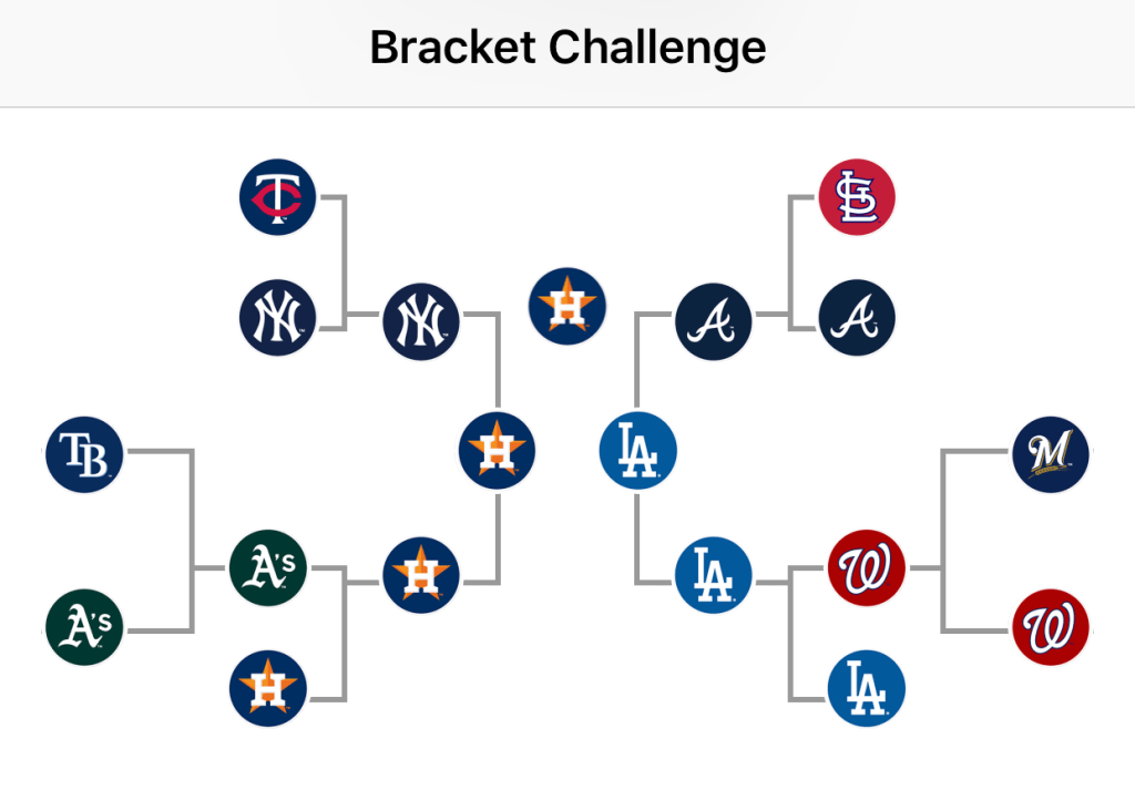 Below is my selection for the Postseason Bracket Challenge on the MLB At Bat app. And because I am a betting man, my selections are super boring, mainly picking chalk.