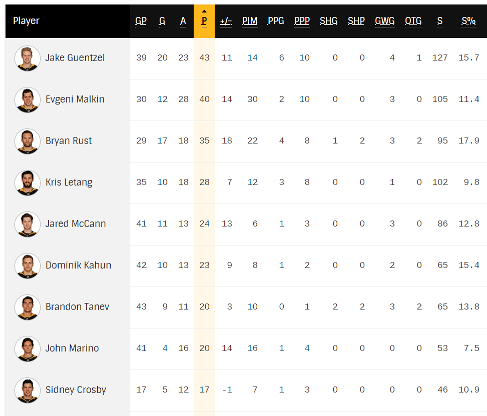 Look at the players who have stepped up to pick up the workload with the NHL’s best player sidelined. Jake Guentzel LEADING THE TEAM, Evgeni Malkin where he should be, but take a gander at the players after. Bryan Rust, Jared McCann, Dominik Kahun, Brandon Tanev, John Marino. None of those players are really players you’d expect to be putting up the numbers they are, with the exception of maybe Jared McCann. Kris Letang is putting up big numbers as well, but I don’t think many people are surprised by that.