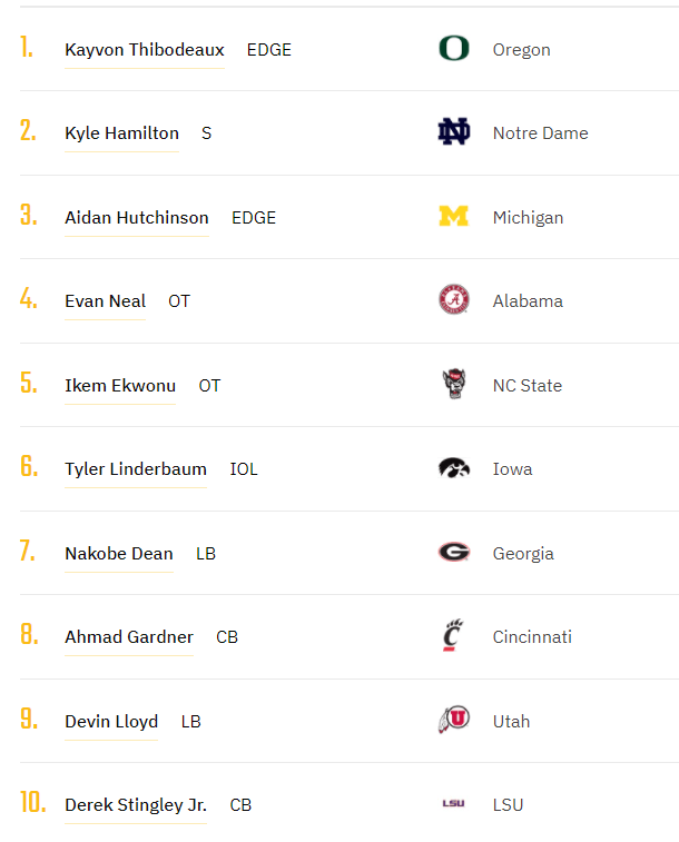 In the ranks 1-10, I started off HOT. I got Thibodeaux at 1 because I believe he has the most upside in this class. He will not go one as his ceiling is sky high, but his floor is not as high as a Hutchinson or a Kyle Hamilton. The two tackles in Neal and Ekwonu follow suit as Trevor Lawrence will need someone to protect his backside. Jacksonville will be happy to have them. The combine and pro-days will determine who will go one out of the 2. I rank Linderbaum wayyyy higher than anyone else though. I believe he is the Quinton Nelson of his position. Nelson obviously was the better prospect, but Linderbaum has potential to be an all-pro at his position from day 1. You know my love for Sauce Gardner so he had to make my top 10. Dean gets the slight edge though simply for a stupid thing called competition level. In my first mock, you saw 2 ILBs go in the top 10 so of course Devin Lloyd made the ranks. The man from DBU in Stingley can also be a stud in this league but this foot injury is such a question mark. It’s a risk but the reward is so high if he’s fully healed.