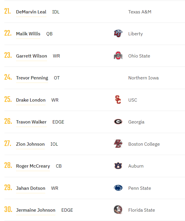 Next we have the 21-30 ranks. We start with DeMarvin Leal who again is all over the place in the ranks. 1 year of solid production but 8.5 sacks in the SEC is nothing to sneeze at. We have my QB3 in Malik Willis who is a phenomenal athlete. There are plenty of questions regarding his accuracy, but the combine and pro day will help him showcase his stuff. Wilson is a very solid receiver and reminds me so much of Elijah Moore. He can do it all, I just don’t see him as explosive as a Burks or a healthy Williams. Penning got a mean reputation at the Senior Bowl trying to start fights with everyone. He’s a mean guy and I’m curious to see what team nabs him. London comes in a bit lower in my ranks mainly because of his explosiveness. He can win any 50-50 ball, but I’ve got concerns about his separation skills. Walker is admittedly one of my favorite edge prospects because of the damage he did in the championship game. It didn’t show up on the box score, but I like how he can set the edge in the run defense. Zion Johnson is another guy getting rave reviews from the Senior Bowl rising up boards. He’s taken snaps at center, but played guard at BC. If he can make that transition to center, his value becomes that much better for his future team. McCreary was a 3 year starter at Auburn but his 40 will determine his ranking. He’s a fringe 1st-early second rounder as of today. Dotson is such a fun WR prospect. He’s undersized, but so damn fast and agile. He’s a great compliment and I keep having visions of him in an offense of Josh Allen, Stefon Diggs, Gabriel Davis, and Dawson Knox. Green Bay is another intriguing landing spot. FSU product Jermaine Johnson rounds out my top 30 here as he’s the only Nole worth mentioning in the first couple rounds. The Georgia transfer entered the SEC and brought it every game. He had a staggering 17.5 tackles for loss and 11.5 sacks. His SEC numbers were less impressive.