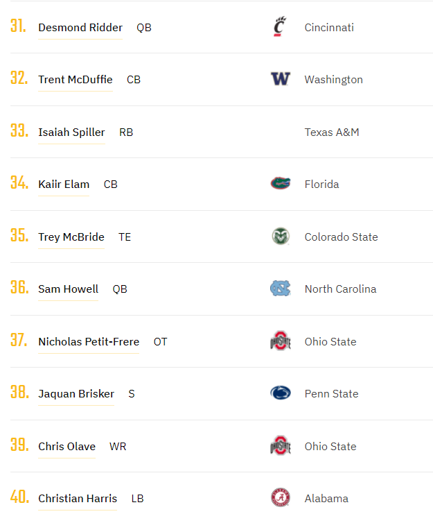 Finally we have 41-50 and we’ll start with KDubIII from MSU. Some thought he was a Heisman trophy caliber back and probably should have gotten the invite over Hutchinson. A transfer from Wake Forest and their air raid offense, at Sparty he finally got to be the focal point and he shined. Mathis is one of my favorite DT prospects as another behemoth on the DL. Daxton Hill is the last S prospect in this ranking as he’s a guy who I think has a chance to leap Brisker as a prospect pending on how he tests. We get to one of my favorite WR prospects in John Metchie III. The WR injuries killed Bama in the championship game but there’s so much to like about him. He has some of the best all-around game in this class from receiving and blocking. It was this play where I actually fell in love with him as a prospect. Dude is tough as hell and I’m excited to see where he lands. Myjai Sanders comes in next here as one of the more explosive guys off the edge. Easily a day 2 pick, but a solid combine could vault him into the first. George Pickens is another lovely WR here but an ACL dropped his value. He is undoubtedly the most undervalued guys in this class. He was the top WR before his ACL injury so I’m curious to see how his situation unfolds. Logan Hall is a guy to keep an eye on as well as his versatility along the DL reminds me of Cam Heyward. Darian Kinnard is one of the more intriguing prospects as he projects to be a guard at the NFL level. I think he’s a bit oversized in a run-heavy offense so I expect him to be targeted more so by pass-happy teams. Darrian Beavers is a guy who I started to enjoy at the Senior Bowl as I took him for granted in that Cincy defense. I think he best fits as an ILB but he has the size to play on the edge as well. Finally to round out my top 50 is Devonte Wyatt. He played all 4 years at Georgia and I project him to be a DE in a 3-4 scheme or DT (3 technique) in a 4-3 scheme.
